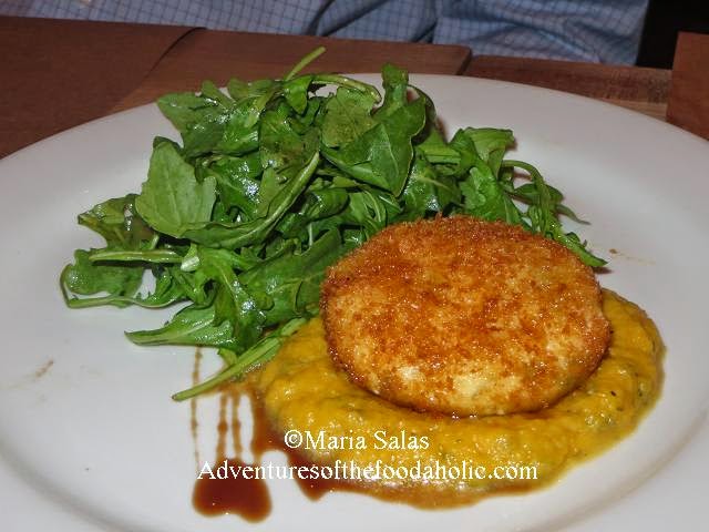 | Medallion de Chevre frit sur Potiron et roquette avec senteurs de truffes Fried goat cheese medallion on pumpkin puree, arugula and truffle oil |